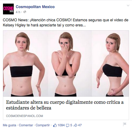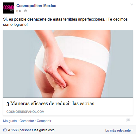 Como soy fan de la revista, siempre aparecen en mi timeline de Facebook sus publicaciones, pero el otro día pasó algo que me hizo ruido; vi algo que me sacó del mundo Cosmo y me hizo pensar: primero vi un post que direccionaba a un artículo sobre una chica que alteró su cuerpo digitalmente para crear conciencia sobre los irreales estándares de belleza. Hasta ahí iba bien, el problema fue hasta que leí la siguiente publicación de la revista; ahora era el enlace de un artículo con el título «3 Maneras eficaces de reducir las estrías», acompañado del nada bonito copy «Sí, es posible deshacerte de estas terribles imperfecciones. ¡Te decimos cómo lograrlo!». Aquí los testigos.